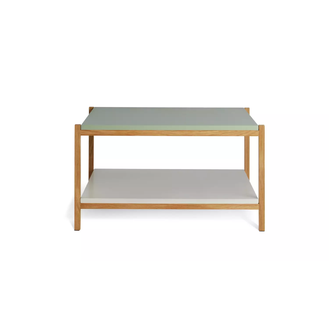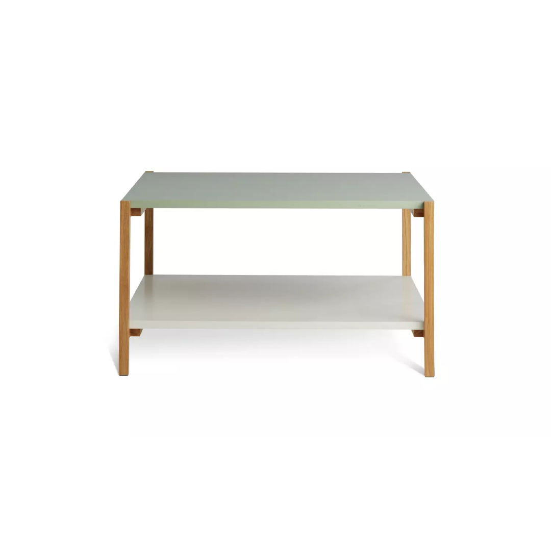 Fresh, funky fun. Here’s a cool coffee table to liven up that lounge. The 2 sturdy shelves in sage green and white are nestled within a natural oak frame. A modern design that brings a playful pop of colour wherever it goes.